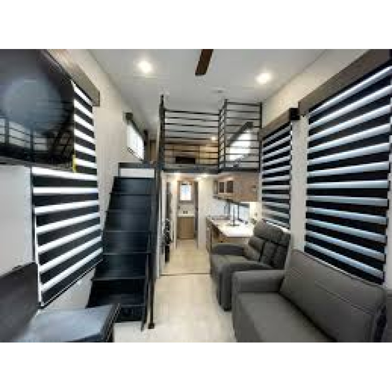 Picture this: a large sliding glass door stretching across the entire width of the trailer, offering you a front-row seat to the most breathtaking views Mother Nature has to offer. Whether you're parked by a serene lake or nestled in the heart of a majestic forest, this trailer will make you feel like you're on top of the world.