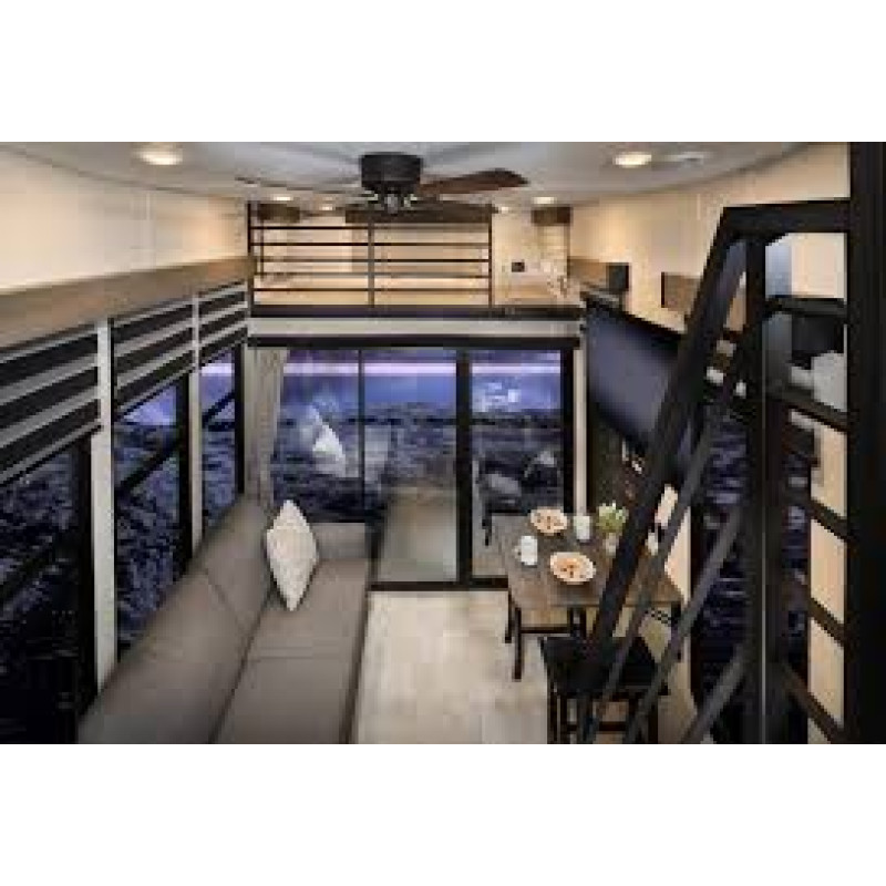it's about creating an experience like no other. Step inside and prepare to be wowed by the almost two-story layout, complete with a couch, recliner, and a bar-height table with trendy bar stools in the main area.